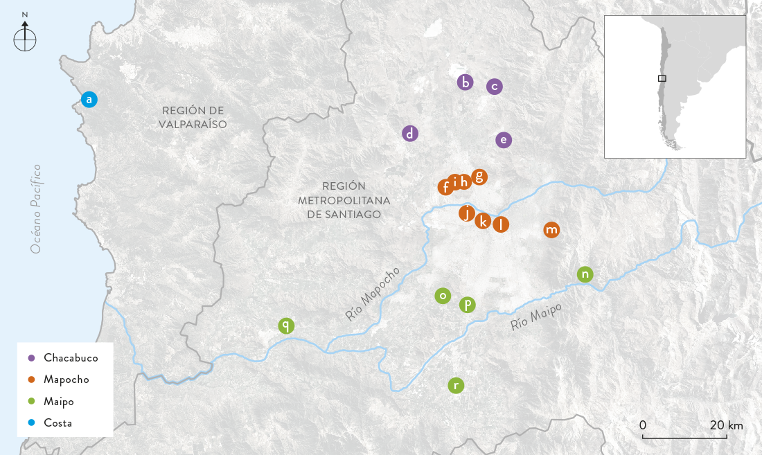Figura 1. Mapa del área de estudio de los sitios funerarios con aysanas en sus contextos: a) Quintay; b) Carmen Alto 9; c) Peldehue; d) Pablo Carvajal; e) Casas de Hacienda; f) Las Tinajas de Quilicura; g) Talleres y Cocheras; h) Parcela 24; i) Quilicura 1; j) Puente Carrascal 1; k) Estación Quinta Normal; l) Marcoleta; m) La Reina; n) Cementerio El Canelo; o) Sector Chena; p) Nos; q) Los Jazmines; r) Fundo del Señor Pacheco. Figure 1. Map of the study area indicating funerary sites where aysanas were recorded: a) Quintay; b) Carmen Alto 9; c) Peldehue; d) Pablo Carvajal; e) Casas de Hacienda; f) Las Tinajas de Quilicura; g) Talleres y Cocheras; h) Parcela 24; i) Quilicura 1; j) Puente Carrascal 1; k) Estación Quinta Normal; l) Marcoleta; m) La Reina; n) Cementerio El Canelo; o) Sector Chena; p) Nos; q) Los Jazmines; r) Fundo del Señor Pacheco.