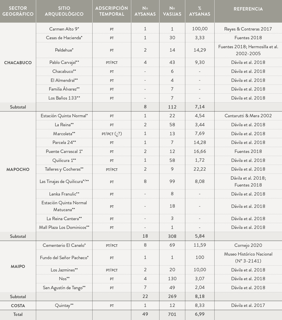 Esta variabilidad es más evidente en el Mapocho, donde la proporción de aysanas por sitio es particularmente heterogénea, lo que puede deberse a la mayor cantidad de contextos mortuorios reconocidos en este sector. En otro aspecto, la presencia o ausencia de estas vasijas parece no guardar directa relación con la cantidad de piezas ofrendadas por sitio, registrándose estas tanto en contextos con pocas ofrendas cerámicas (Carmen Alto, Fundo del Señor Pacheco, Parcela 24 y Talleres y Cocheras) como en aquellos en que son abundantes (Las Tinajas de Quilicura, Nos, La Reina y Pablo Carvajal).