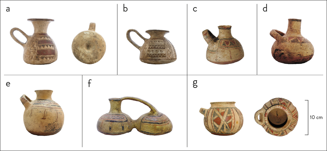 Figura 2. Variabilidad morfométrica de las aysanas del Maipo-Mapocho: a–e) formas más comunes; f) de doble cuerpo; g) de cuerpo fitomorfo (a y b, Las Tinajas de Quilicura, mnhn 2014.1.1038 y mnhn 2014.1.1003, respectivamente, Museo Nacional de Historia Natural, Santiago, Chile; c, Marcoleta, mnhn Ch.C.28.1, Museo Nacional de Historia Natural, Santiago, Chile; d, Talleres y Cocheras, vasija 2, proyecto fondecyt N° 1140803; e y f, San Agustín de Tango, N° 10515 y N° 10401, respectivamente, Museo de Colchagua, Santa Cruz, Chile; g, Pablo Carvajal, N° LM.II.299, Museo Arqueológico Valle de Chicauma, Lampa, Chile) (todas las fotografías e ilustraciones son de los autores, excepto cuando se indica). Figure 2. Morphometric variability of aysanas from the Maipo-Mapocho Basin: a–e) most common forms; f) double-bodied; g) phytomorphic-bodied. (a and b, Las Tinajas de Quilicura, mnhn 2014.1.1038 and mnhn 2014.1.1003, respectively, Museo Nacional de Historia Natural, Santiago, Chile; c, Marcoleta, mnhn Ch.C.28.1, Museo Nacional de Historia Natural, Santiago, Chile; d, Talleres y Cocheras, vessel 2, fondecyt N° 1140803 project; e and f, San Agustín de Tango, N° 10515 and N° 10401, respectively, Museo de Colchagua, Santa Cruz, Chile; g, Pablo Carvajal, N° LM.II.299, Museo Arqueológico Valle de Chicauma, Lampa, Chile) (all photos and illustrations by the authors, unless otherwise indicated).
