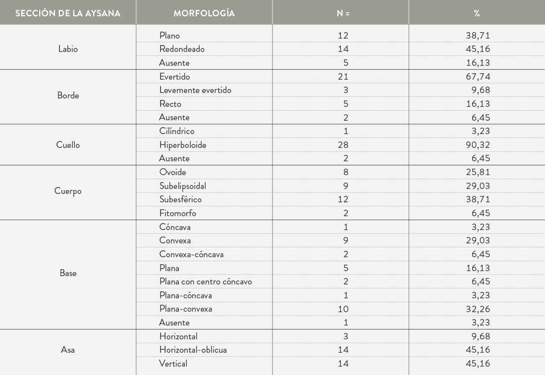 El análisis morfológico se realizó a partir de la información recopilada de las 31 aysanas estudiadas sistemáticamente. La forma general y de sus secciones se describieron siguiendo las propuestas de Anna Shepard (1976) y se consignaron las medidas de volumen, peso, espesor, diámetro y longitud total. Para discutir las tipologías formales existentes (Bingham 1915; Fernández 1971; Meyers 1975; Bray 2003), se utilizó un índice de relación de las medidas del diámetro de la unión cuello-cuerpo y de la altura del cuello de las vasijas.