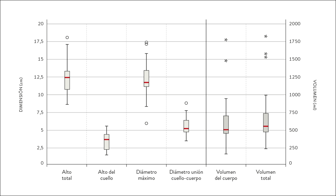 Las vasijas son de pequeño tamaño, de promedio 12 cm de altura y ancho máximo. La extensión del cuello varía entre 1,3 cm (corto) y 5,4 cm (largo), con una media de 3,4 cm. El diámetro de la base del cuello fluctúa entre 3,3 cm (estrecho) y 8,8 cm (amplio), de 5,7 cm promedio (fig. 3). No se observó agrupamiento que los diferencie por altura o diámetro de la base del cuello. Su capacidad volumétrica refuerza la idea de que son contenedores pequeños, registrándose valores en el cuerpo que oscilan entre 150 ml y 1800 ml, con una media de 688 ml. Al considerar la capacidad de la vasija completa (incluyendo el cuello), los valores son similares, entre 225 ml y 1850 ml y promedio de 699 ml (fig. 3).