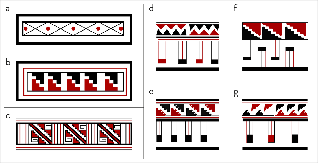 Figura 5. Diseños y motivos de md-A: a–c) variedades de banda superior; d–g) variedades de banda superior con elemento inferior fitomorfo. Figure 5. Designs and motifs of db-A: a–c) upper-band variants; d–g) upper-band variants with a lower phytomorphic element.