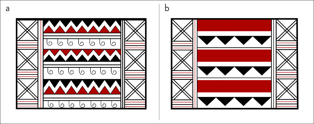 En la variedad md-C (fig. 4c) el campo decorativo se divide en dos bandas horizontales compuestas por motivos cuadrados o trapezoidales y reticulados oblicuos en su interior. La oposición de colores ocurre en las líneas que demarcan a estos últimos (fig. 7a). Un ejemplar presenta división cuatripartita en sus campos cuadrangulares, generando triángulos opuestos por el vértice a partir del principio de reflexión especular del elemento mínimo (triángulo escalonado) (fig. 7b). En la banda superior también se da este tipo de reflexión en un motivo de ave esquemática de cuerpo triangular de estilo La Paya (Calderari 1991), donde se incluye la idea de oposición cromática de rojo y negro.