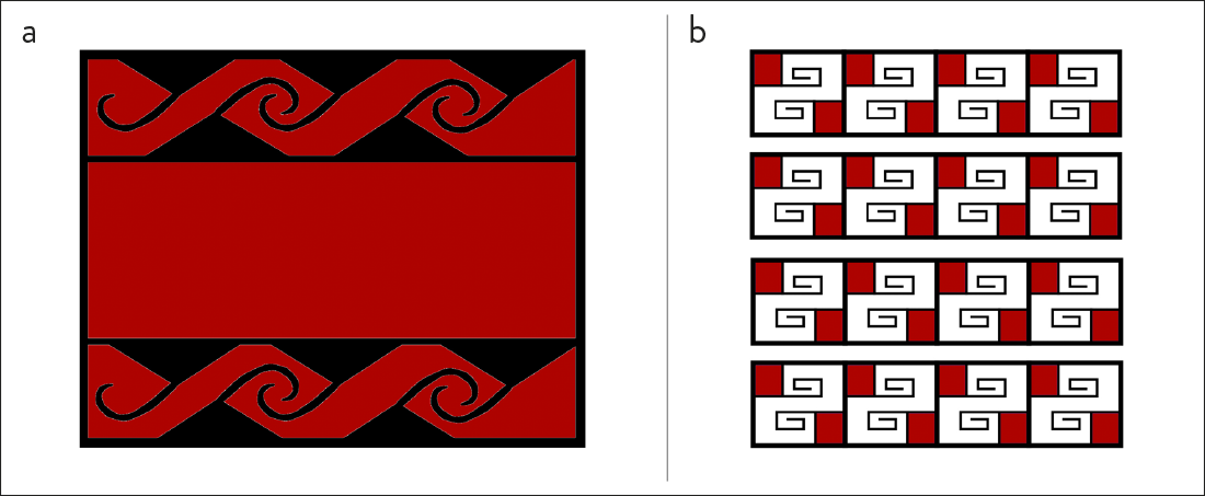 Figura 11. Diseños y motivos poco recurrentes de md-Otras: a) triángulo con volutas; b) “patrón cadenas” (González 2013). Figure 11. Less recurrent designs and motifs of dm-Other: a) triangle with volutes; b) “chain pattern” (González 2013).