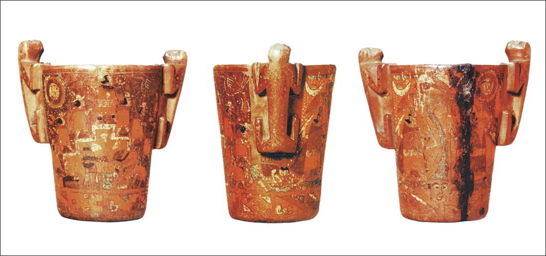 Figura 1. Vistas del kero colonial cusqueño VA28404 (alto 24,4 cm, diámetro 17,5 cm), Staatliche Museen zu Berlin, Berlín, Alemania (modificada desde Wichrowska y Ziółkowski [2000: 118]). Figure 1. Views of the colonial Cusqueño kero VA28404 (height 24.4 cm, diameter 17.5 cm), Staatliche Museen zu Berlin, Berlin, Germany (modified from Wichrowska and Ziółkowski [2000: 118]).