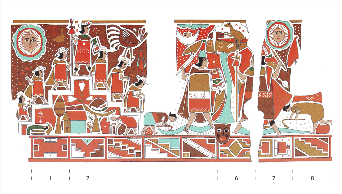 Figura 2. Kero VA28404. Escenas superiores: izquierda “pirámide de la vida”, derecha, limpia de canales de regadío; franja de tocapus identificados, de izquierda a derecha: 1) Cusco, 2) hatun, 6) wiracocha, 7) huasi, 8) capac (modificada desde Wichrowska y Ziółkowski [2000: 118]). Figure 2. Kero VA28404. Upper left scene, “pyramid of life”; upper right scene, cleaning irrigation channels; identified tocapus band, from left to right: 1) Cusco, 2) hatun, 6) wiracocha, 7) huasi, 8) capac (modified from Wichrowska and Ziółkowski [2000: 118]).