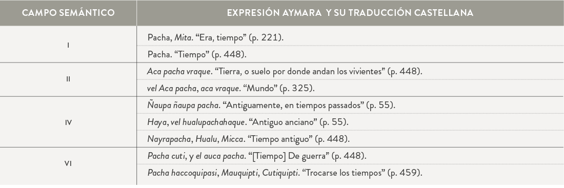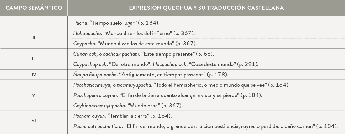Tabla 2. Campos semánticos del vocablo “pacha” en el léxico quechua de Diego González de Holguín (2007 [1608]). Table 2. Semantic fields of the term “pacha” in Diego González de Holguín’s Quechua lexicon (2007 [1608]).