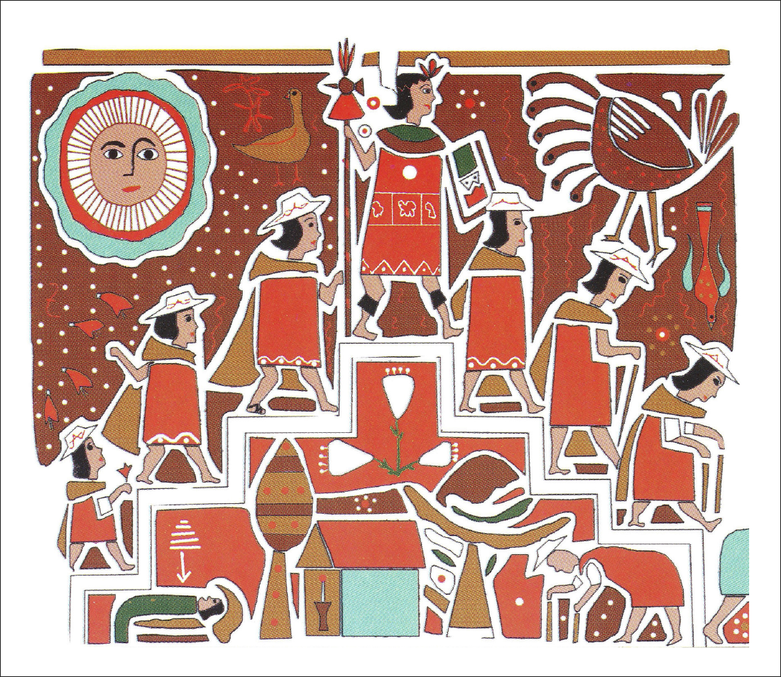 Si la media chakana expresa un ciclo, la del kero manifiesta el ciclo de vida. Por lo tanto, esta imagen podría hacer referencia a que la cúspide de este ciclo es el momento de reconexión con el tiempo y el territorio andino, que proponemos también está presente en la imagen opuesta del vaso. Según Platt (1996: 33) en Macha la fiesta del Corpus Christi era el clímax del calendario cristiano. En la celebración cusqueña de este acontecimiento los descendientes de las panaca-s adoptaban la vestimenta inkaica (Dean 2002). En diversas localidades andinas se ha observado un sistema de cargos que combina funciones civiles y religiosas cuyo ejercicio formaba una suerte de camino ritual o thaki, al que aspiraban las élites locales (Abercrombie 2006). Con el cumplimiento de estas funciones, los hombres aspiraban a aumentar su prestigio social y ascender en la escala de autoridad de sus comunidades. Es más, Sinclair Thomson (2007: 70) refiere a esta práctica específicamente como una “escalera de cargos”. Por lo tanto, el kero estaría representando varias temporalidades simultáneas: el ciclo vital-sociopolítico y la escalera de cargos, el ciclo anual, el ciclo festivo y el ciclo mayor del tiempo-cosmos, expresado en el vocablo pacha. Atendiendo a los vaticinios de la época, también anuncia el “retorno del Inka”.
