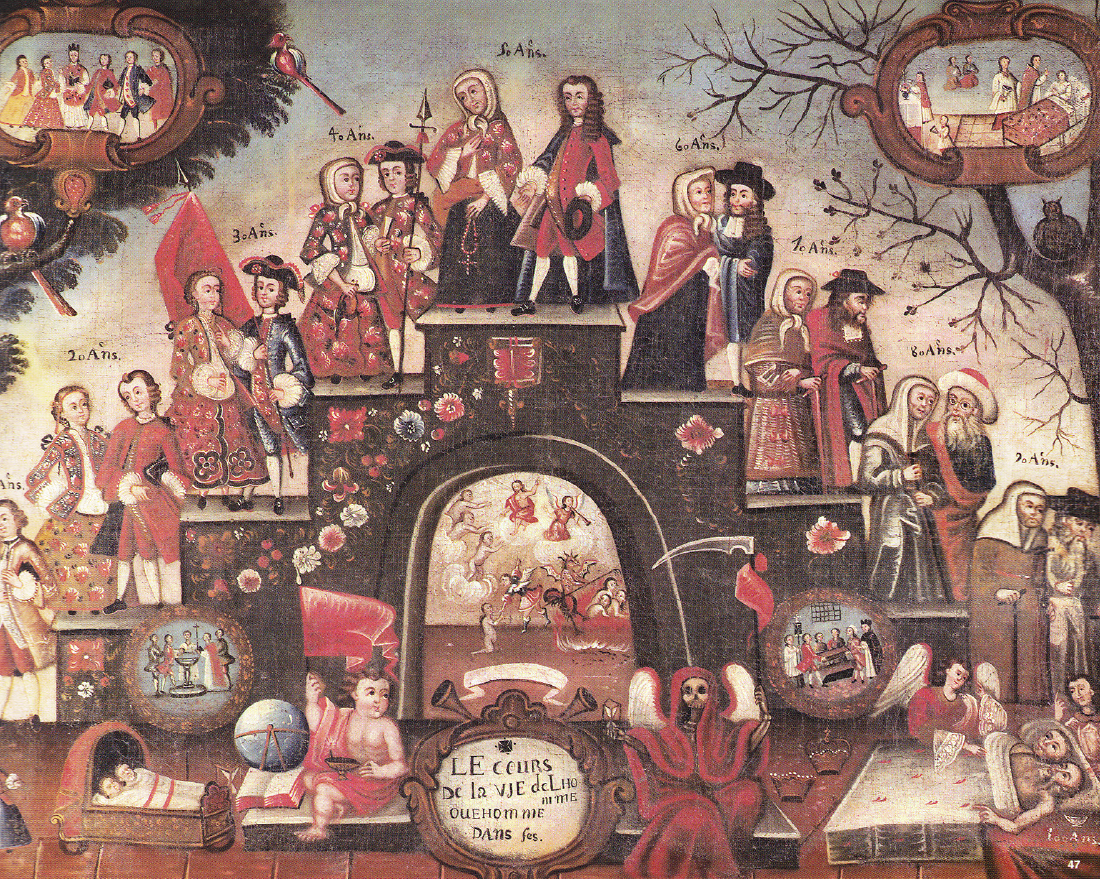 Podemos dar cuenta de la existencia de dos lienzos confeccionados en América con imágenes del motivo escala de la vida, con características similares a las del objeto analizado. Uno de ellos se encuentra en el Museo Nacional del Virreinato, en Tepotzotlán, México, datado en el siglo xviii, que presenta dos escalas de vida, la de un hombre y la de una mujer de las élites coloniales. El otro corresponde a una pieza del Cusco del siglo xviii, atribuida a la Escuela cusqueña, en la que se representan las etapas vitales de una pareja de la élite hispana (fig. 4).
