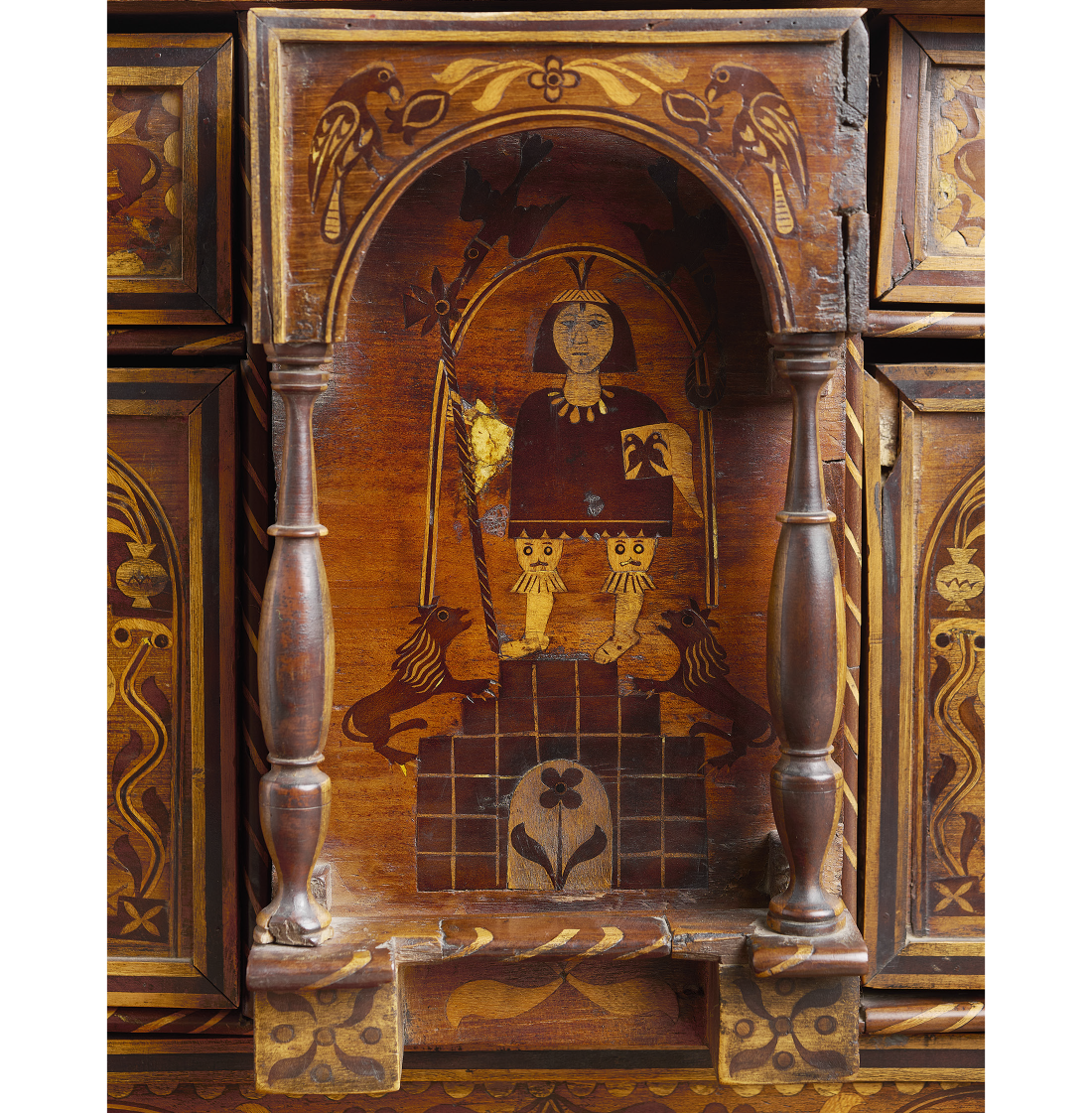 Figura 5. Detalle de la imagen del Inka en el bargueño cusqueño, siglo xviii, MCM 097 (alto 42,5 cm, largo 84,5 cm), Museo del Carmen de Maipú, Santiago, Chile (fotografía de Nicolás Aguayo, modificada desde Sanfuentes [2024: 63]). Figure 5. Detail of the Inka image in the Cusqueño bargueño (Spanish cabinet), 18th century, MCM 097 (height 42.5 cm, length 84.5 cm), Museo del Carmen de Maipú, Santiago, Chile (photo by Nicolás Aguayo, modified from Sanfuentes [2024: 63]).