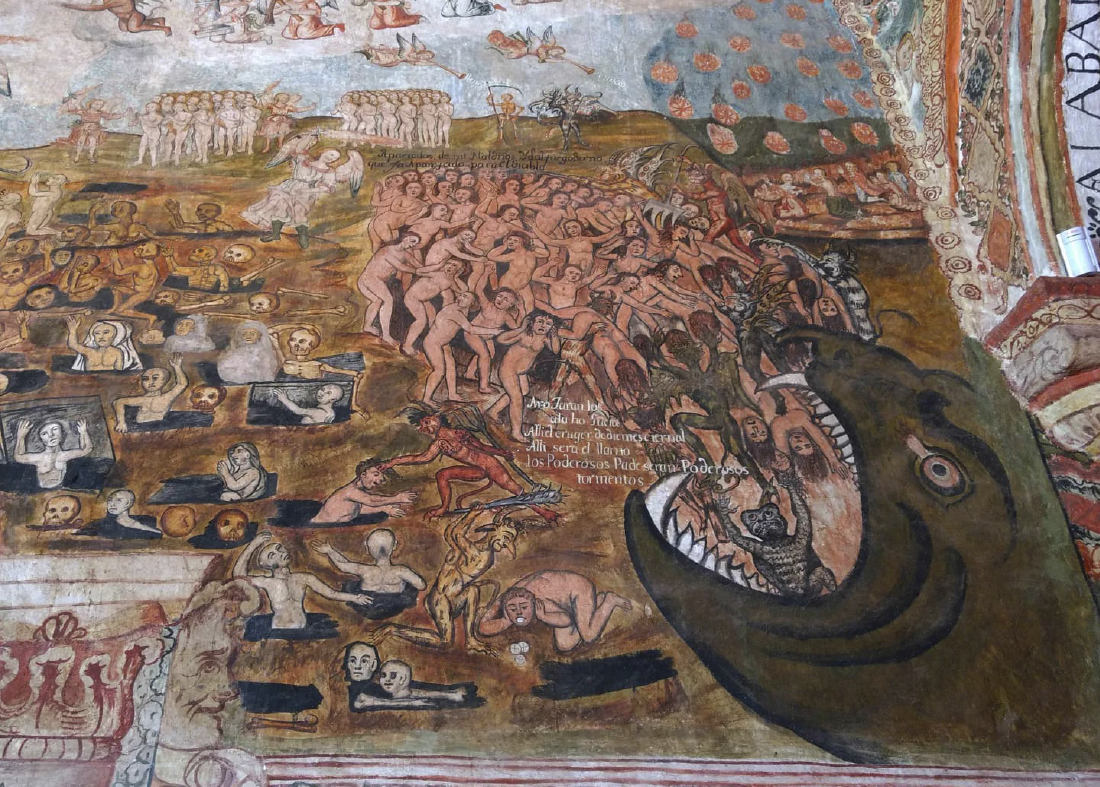 Figura 6. Las Postrimerías en el Juicio Final, pintura mural de la iglesia de San Juan Bautista en Huaro, Cusco, Perú (tarjeta postal de Ruta del barroco andino). Figure 6. The Last Things in the Last Judgment, mural painting from the Church of San Juan Bautista in Huaro, Cusco, Peru (postcard from the Andean Baroque Route).