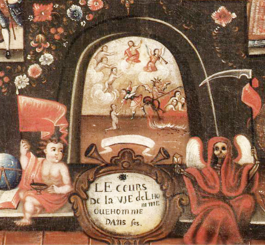 La principal diferencia que tiene el motivo de la escala de la vida presente en el kero con las representaciones cusqueñas es el centro del puente. Mientras en el lienzo del Cusco se muestra una pareja de la élite colonial que asciende y desciende por la escala, en el vaso aparece el ciclo vital y sociopolítico de un hombre andino, partiendo por la figura de un niño de la élite indígena, con capa y sombrero, quien al llegar a la cúspide hace relucir su vestimenta inka colonial (Dean 2002), destacándose la mascaypacha que evidencia su posición de autoridad. Al descender retoma su indumentaria de indio cristiano (Ossio 2008: 136). En el lienzo, la vida de la pareja termina en su lecho de muerte a la espera del Juicio Final (fig. 7). En este punto, el kerocamayoc busca disputar la representación cristiana, pues al terminar de descender, el anciano parece girar en dirección al interior del puente en un gesto de dirigirse a la casa desde donde había salido siendo wawa. Así, no hay señales de un final evidente: a diferencia de las estampas europeas y las representaciones cusqueñas, el kero no tiene una imagen de la muerte.