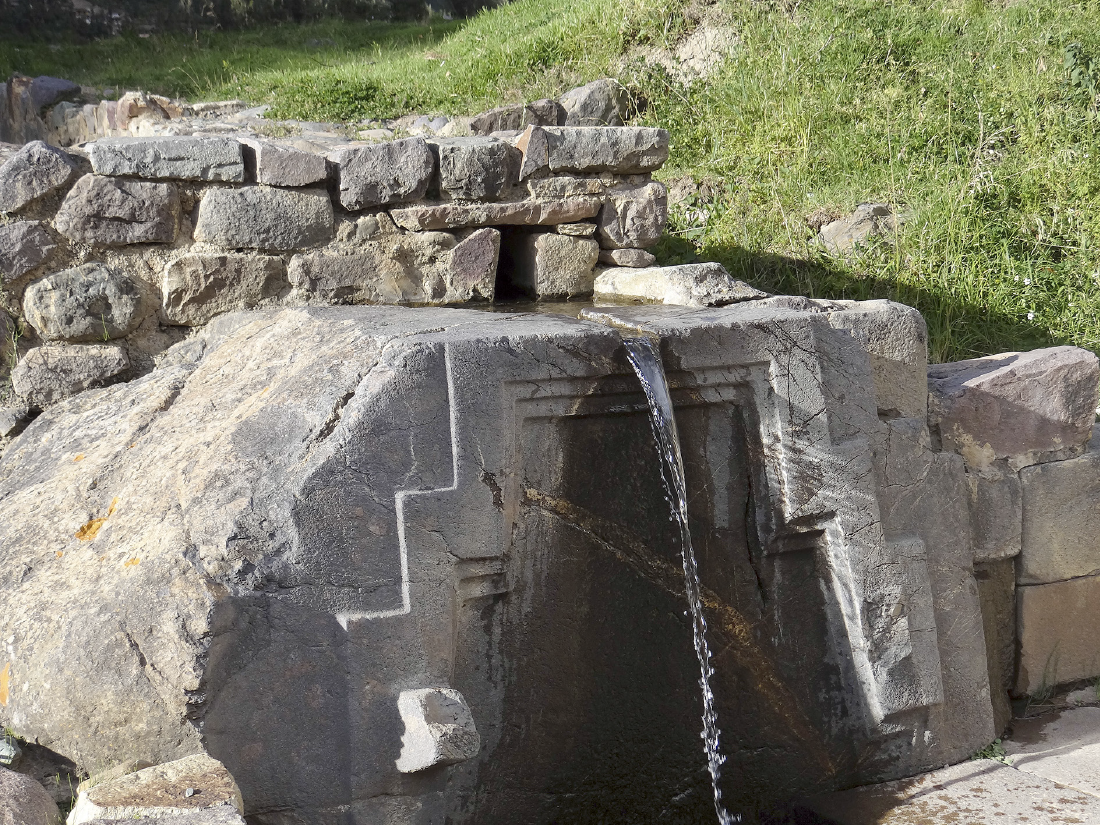 Existe otro soporte material que dialoga con la escala de la vida del kero cusqueño y la imagen en el bargueño colonial (fig. 4), que también contempla a un Inka en la cúspide de una media chakana: se trata de los ushnu-s, plataformas piramidales de piedra sobre las que se realizaban sacrificios y libaciones, y en los que solo podían subir sujetos de autoridad (fig. 10). Consideramos que esta relación entre la pirámide-escalera-puente de la vida, chakana y ushnu podría entregar algunas luces sobre la otra escena principal del kero, en la que dos Inkas se encuentran frente a frente, cada uno a un costado del manantial, uno acompañado del Sol y el otro de la Luna.