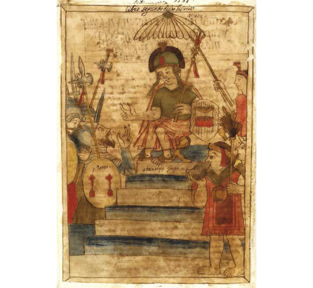 Figura 10. Representación del inka Atahualpa sobre un ushnu, donde se aprecia la media chakana en la arquitectura inkaica de Ollantaytambo, provincia de Urubamba, departamento del Cusco (ilustración de Martín de Murúa [1590], en Korpisaari y Pärssinen [2011: plate 64]). Figure 10. Representation of the Inka Atahualpa on an ushnu, showing the half-chakana in Inka architecture at Ollantaytambo, Urubamba Province, Cusco Department (illustration by Martín de Murúa [1590], in Korpisaari & Pärssinen [2011: plate 64]).